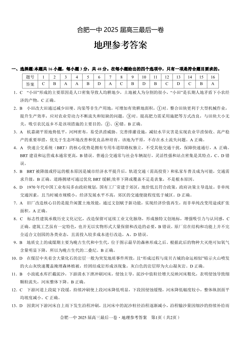 安徽省合肥市一中2025届高三下学期最后一卷地理答案