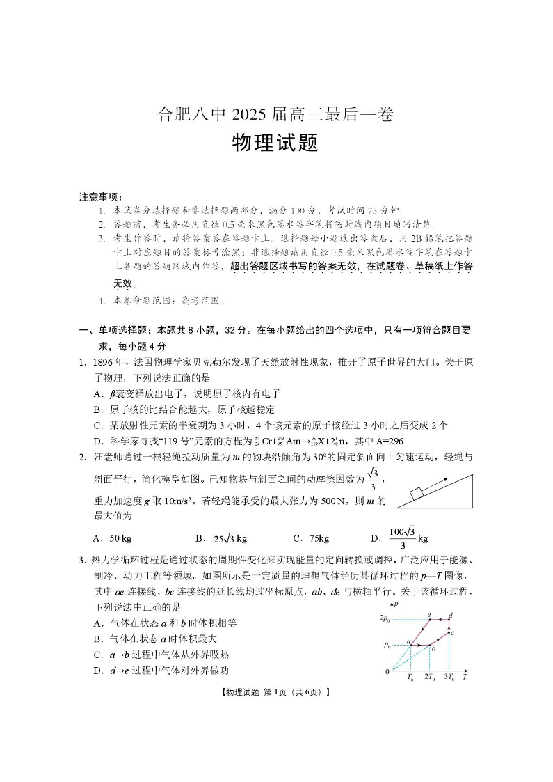 安徽省合肥市八中2025届高三下学期最后一卷物理+答案