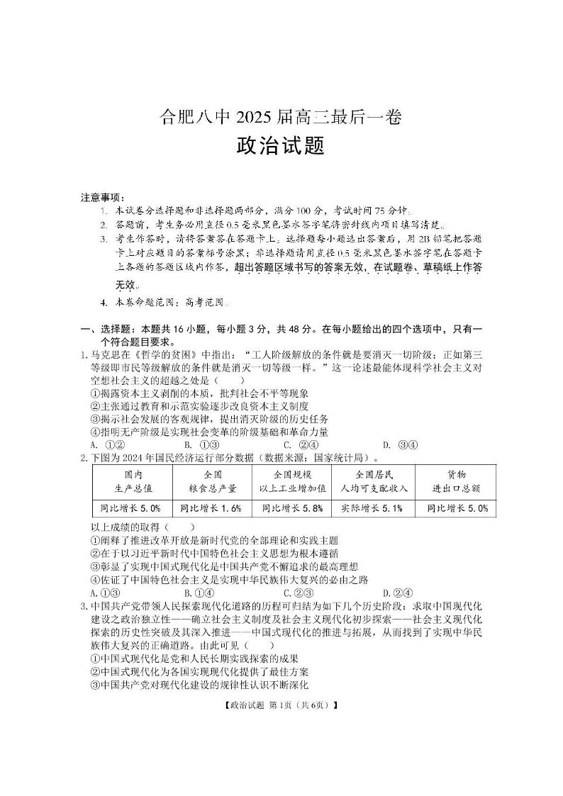 安徽省合肥市八中2025届高三下学期最后一卷政治