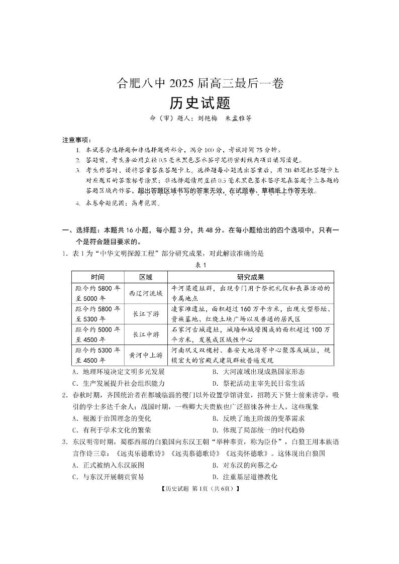 安徽省合肥市八中2025届高三下学期最后一卷历史+答案