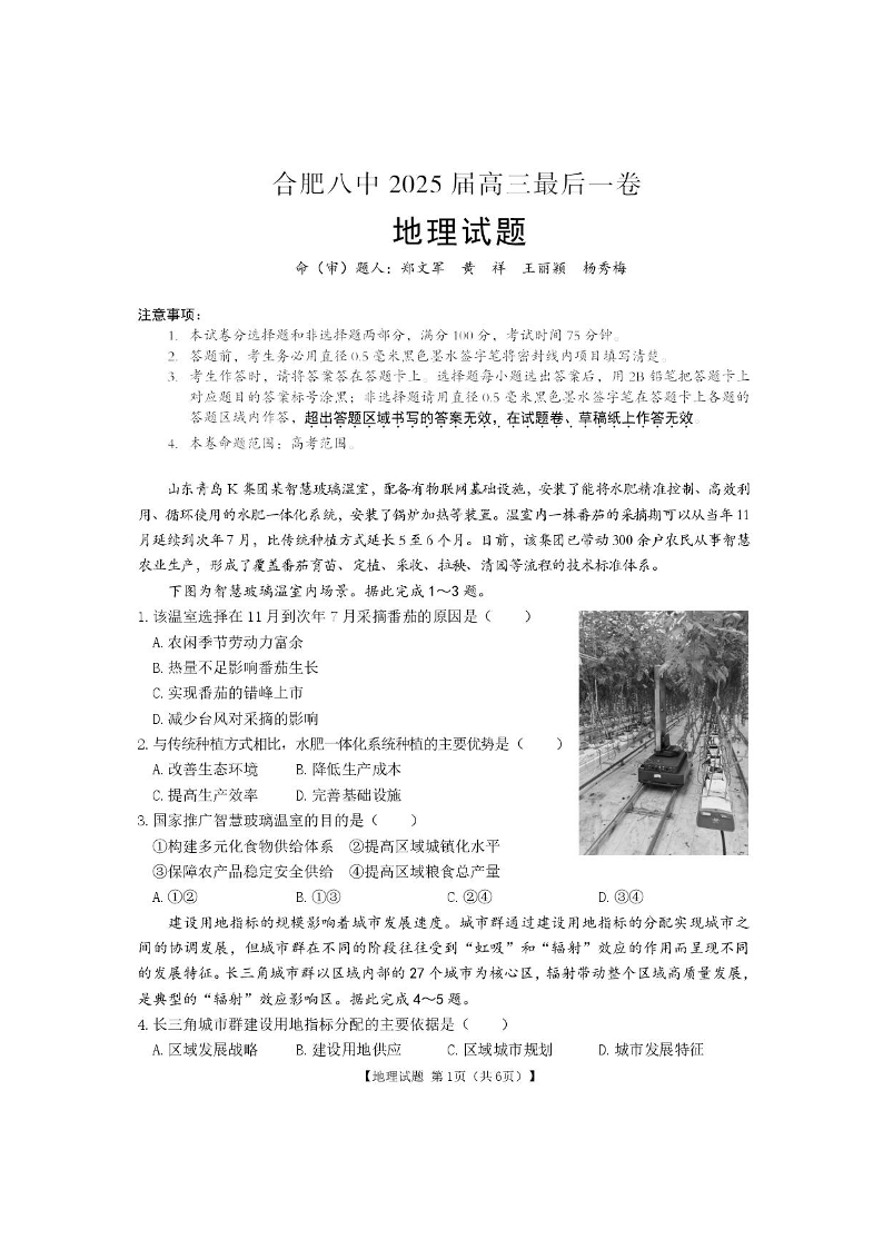 安徽省合肥市八中2025届高三下学期最后一卷地理+答案