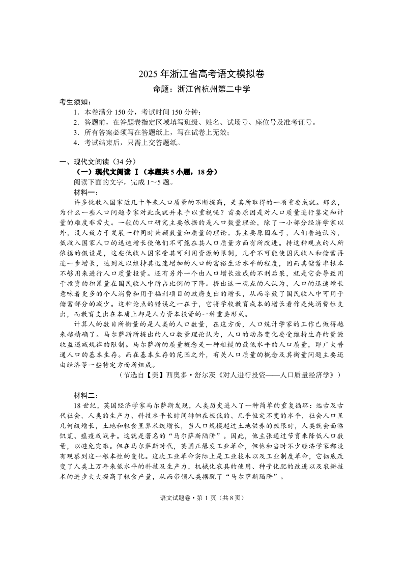 浙江省六所名校联盟2025届高三5月模拟预测卷语文+答案
