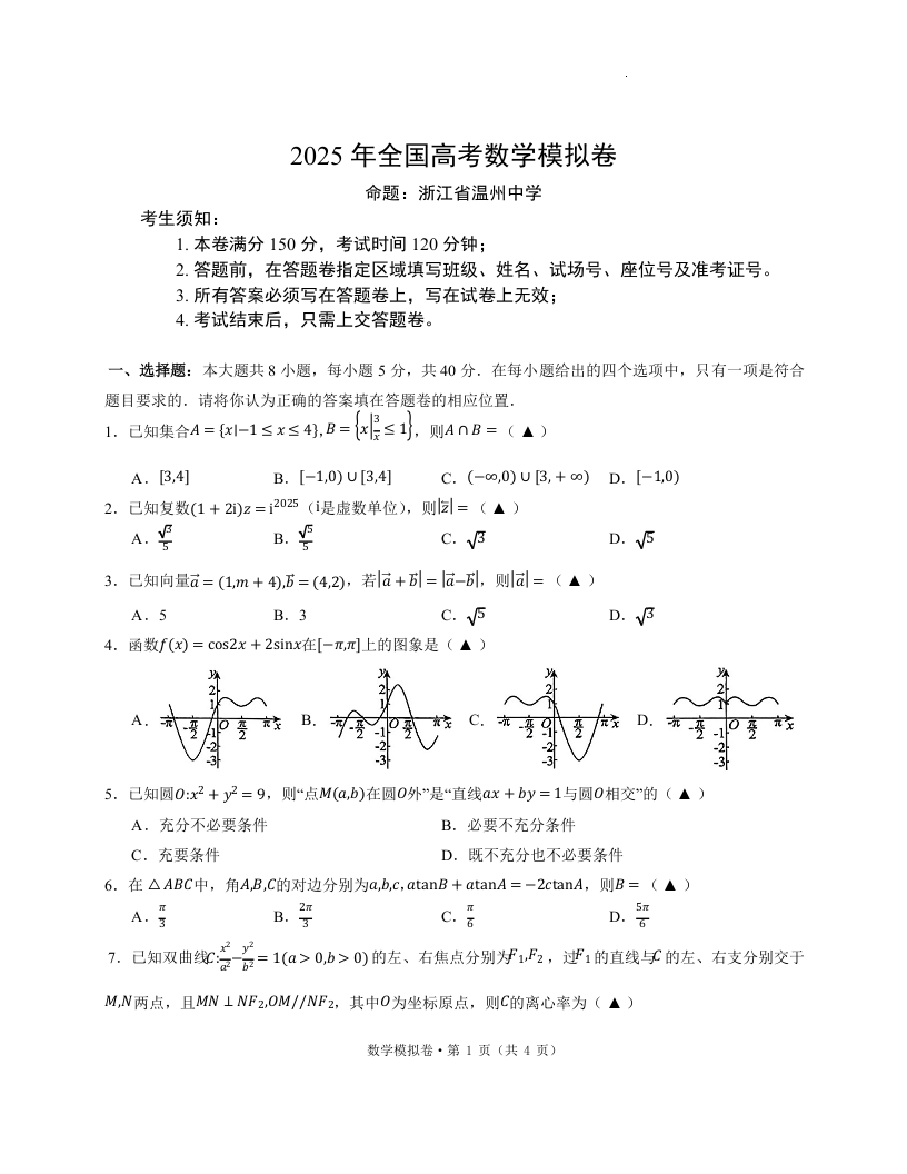 浙江省六所名校联盟2025届高三5月模拟预测卷数学