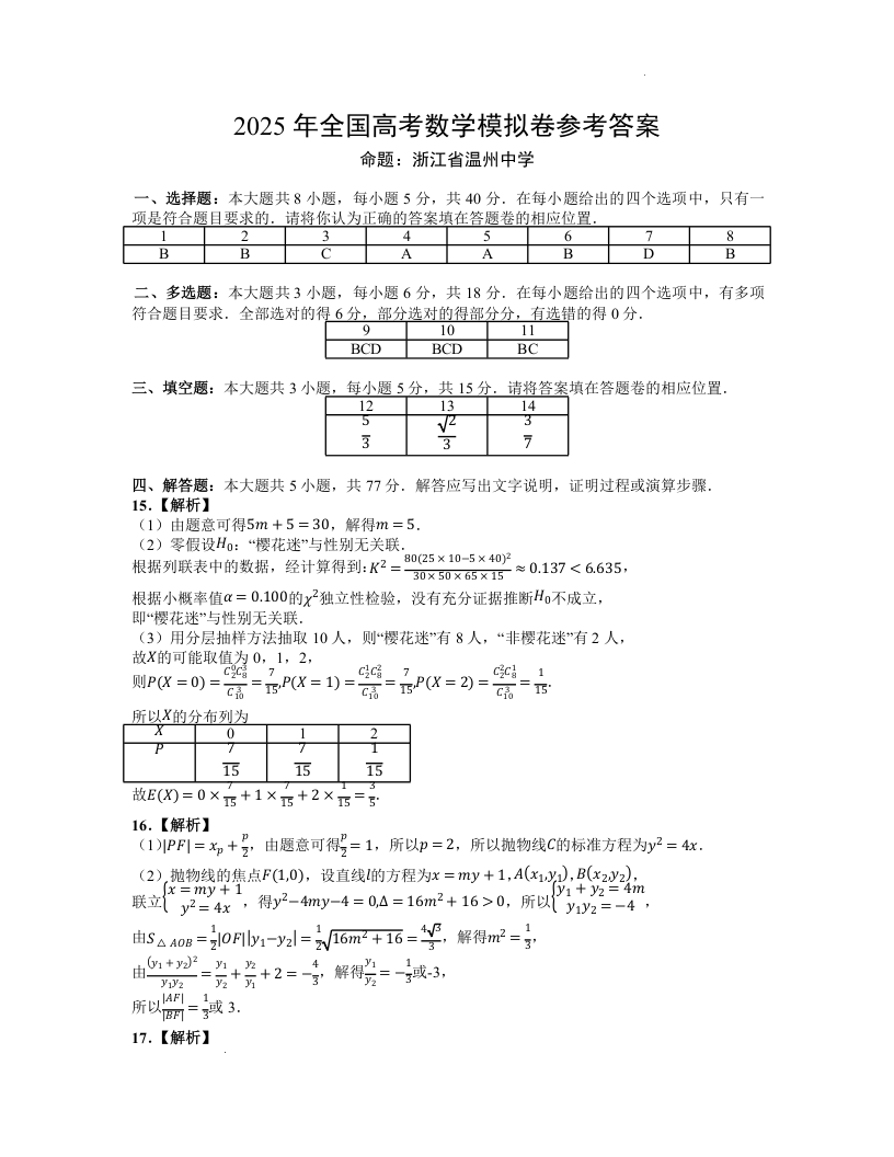 浙江省六所名校联盟2025届高三5月模拟预测卷数学答案
