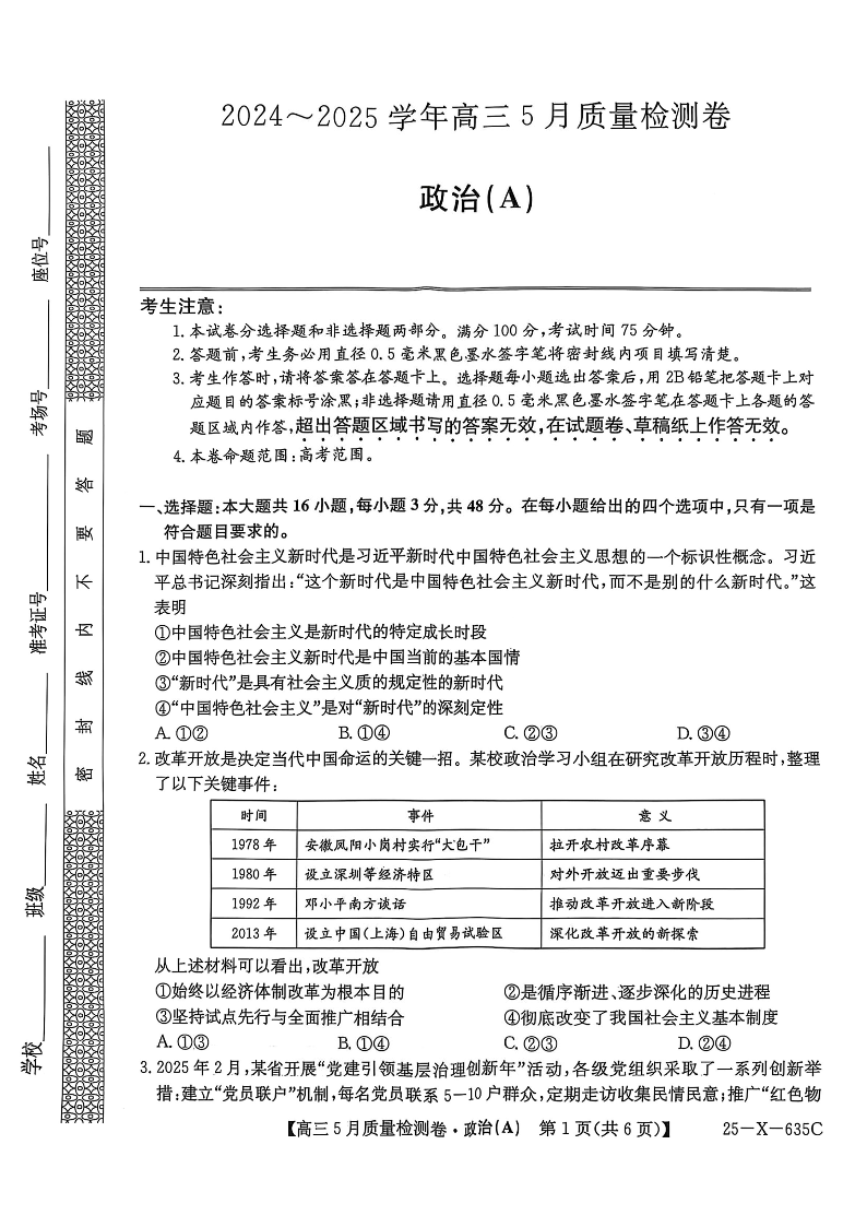 山西省三晋卓越联盟2025届高三5月质量检测政治