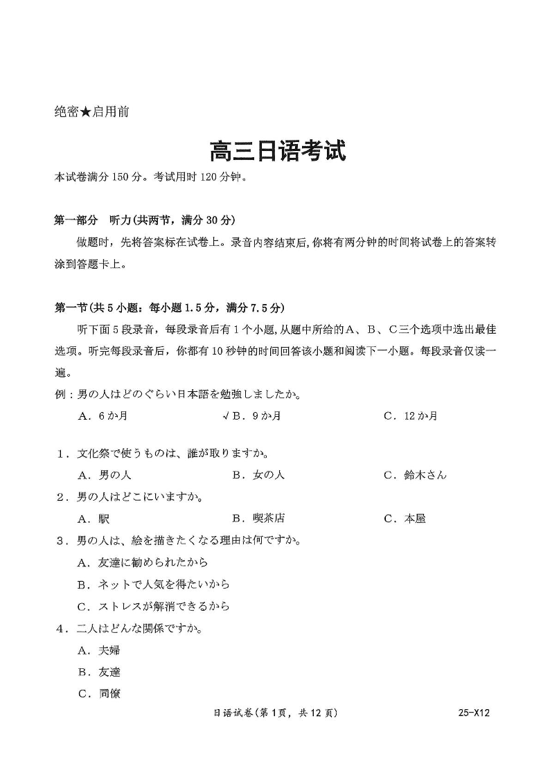 河南省创新发展2025届高三下学期5月高考适应性考试日语+答案