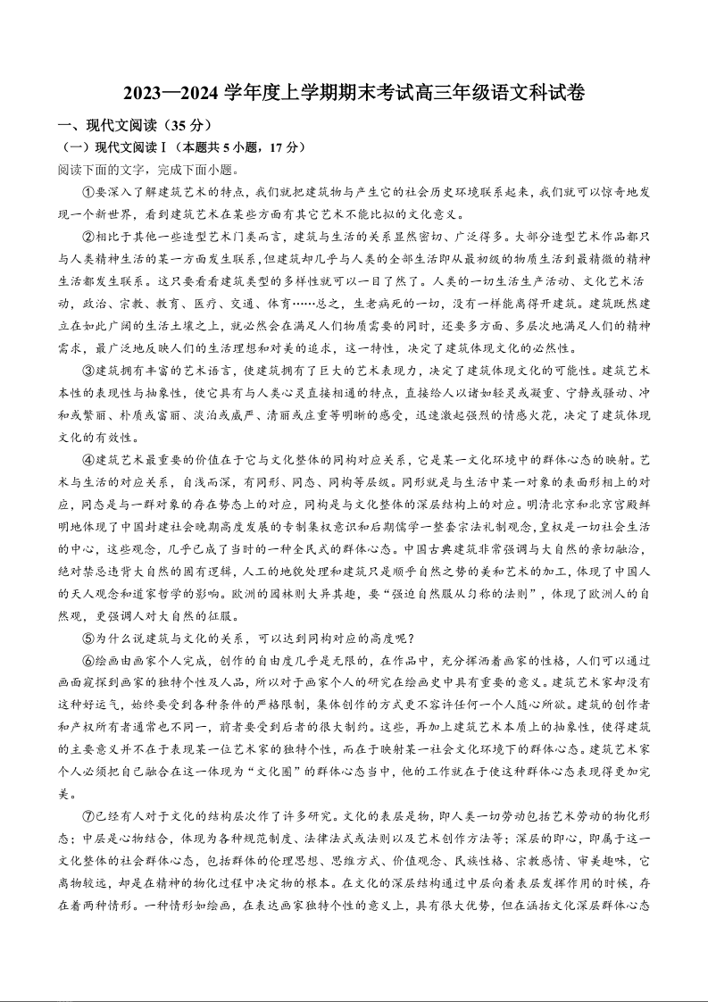 辽宁省五校联考(大连市二十四中学、大连八中、辽宁省实验中学、鞍山一中、东北育才学校)2024届高三上学期期末考试语文+答案