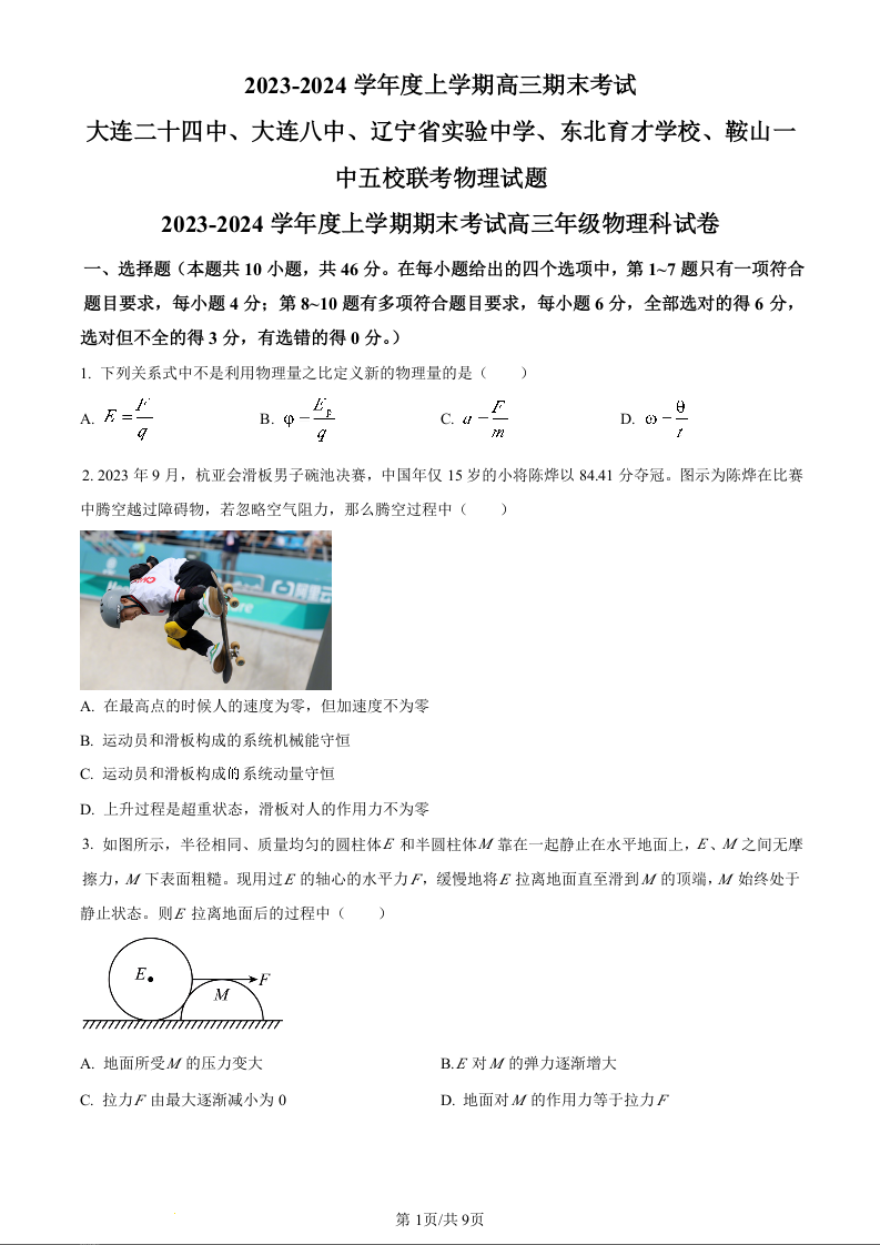 辽宁省五校联考(大连市二十四中学、大连八中、辽宁省实验中学、鞍山一中、东北育才学校)2024届高三上学期期末考试物理(原卷版)