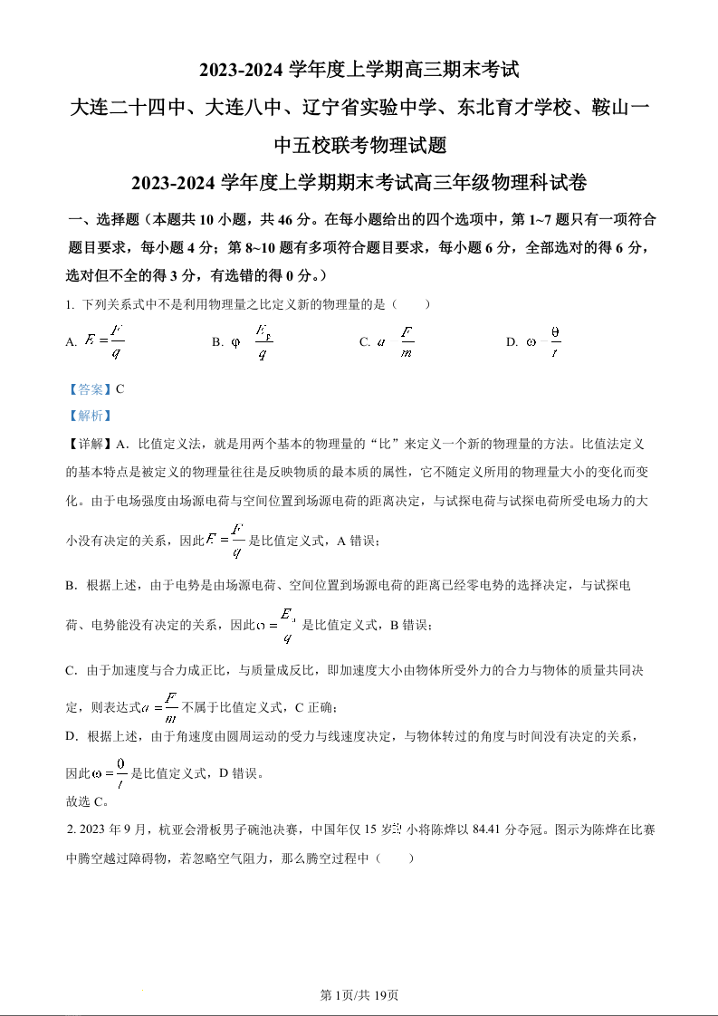 辽宁省五校联考(大连市二十四中学、大连八中、辽宁省实验中学、鞍山一中、东北育才学校)2024届高三上学期期末考试物理(精品解析版)