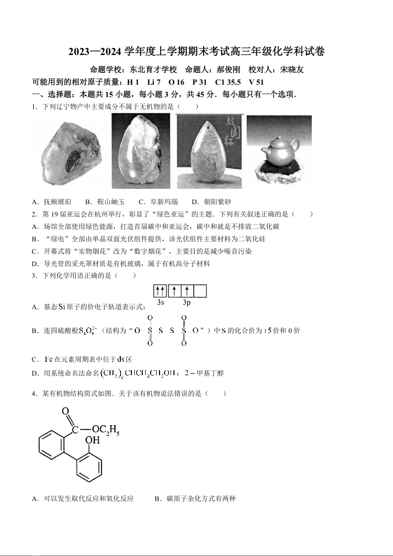 辽宁省五校联考(大连市二十四中学、大连八中、辽宁省实验中学、鞍山一中、东北育才学校)2024届高三上学期期末考试化学+答案