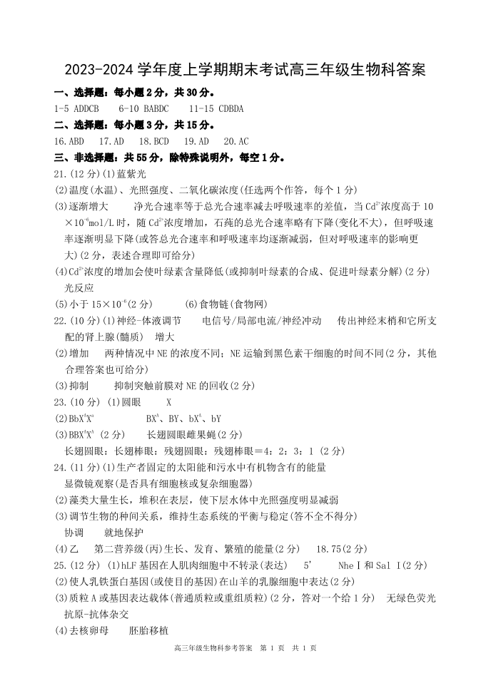 辽宁省五校联考(大连市二十四中学、大连八中、辽宁省实验中学、鞍山一中、东北育才学校)2024届高三上学期期末考试生物答案