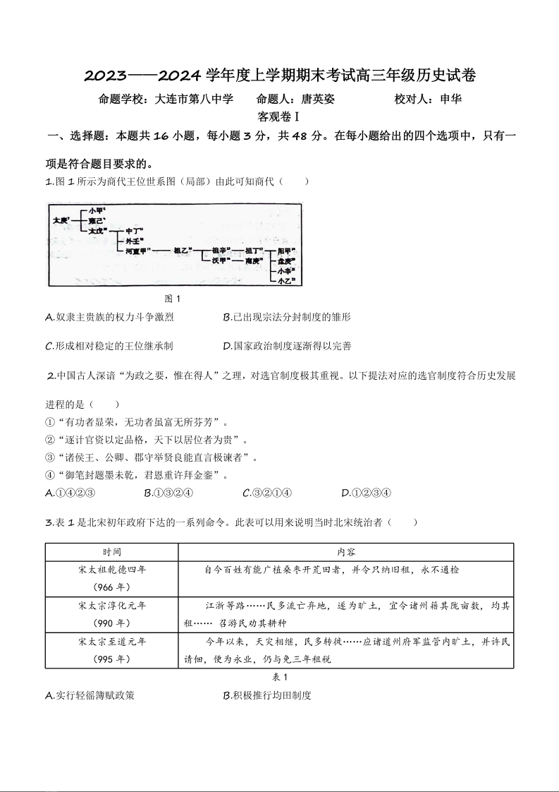 辽宁省五校联考(大连市二十四中学、大连八中、辽宁省实验中学、鞍山一中、东北育才学校)2024届高三上学期期末考试历史+答案