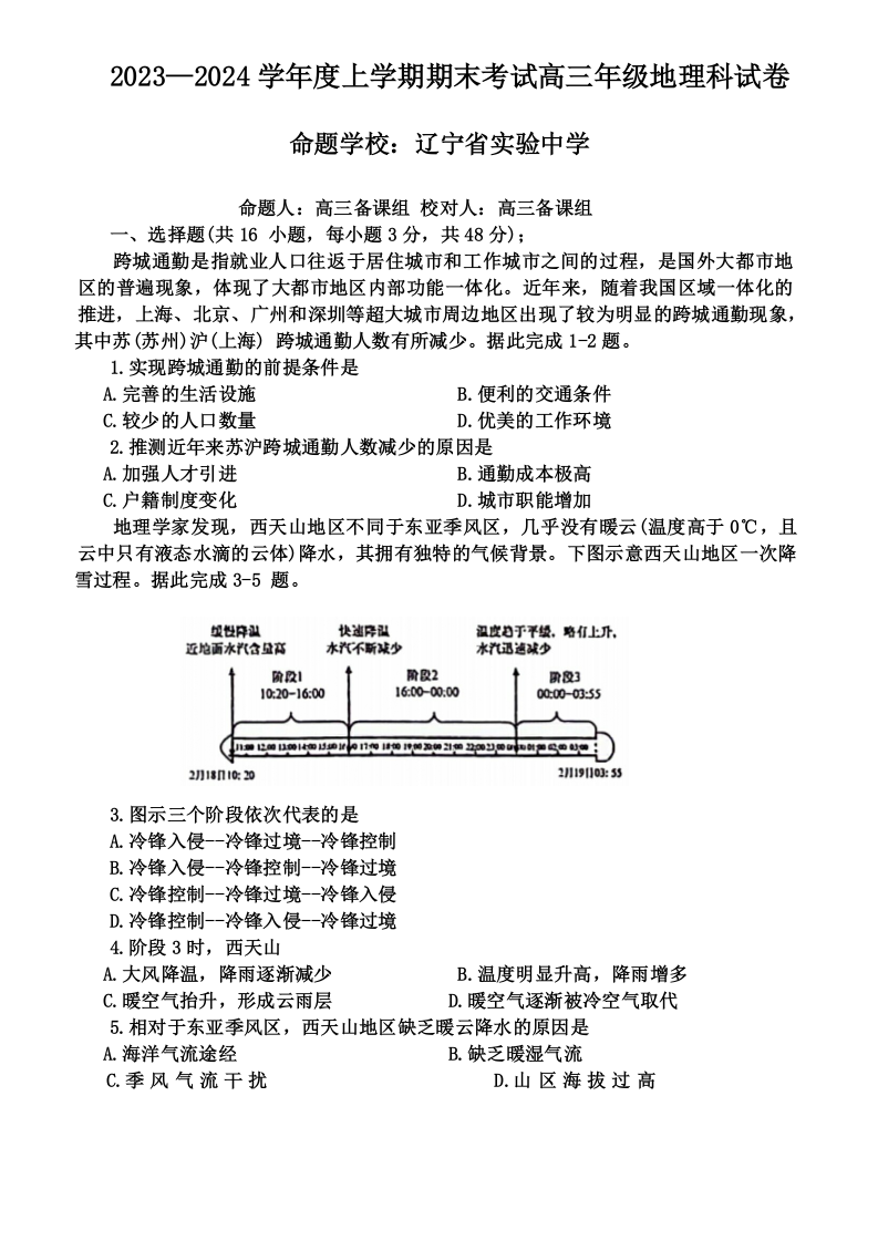 辽宁省五校联考(大连市二十四中学、大连八中、辽宁省实验中学、鞍山一中、东北育才学校)2024届高三上学期期末考试地理
