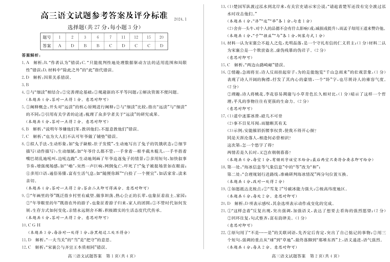 山东省滨州市2024届高三上学期期末考试语文答案