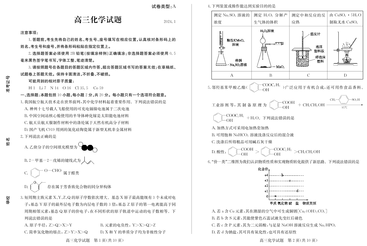 山东省滨州市2024届高三上学期期末考试化学