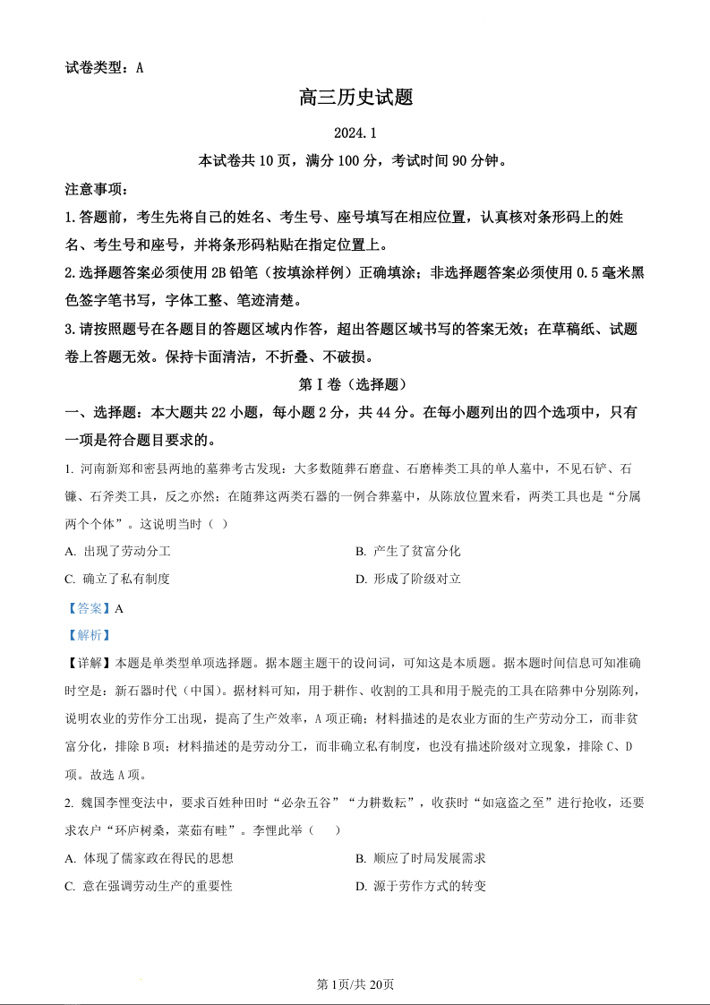 山东省滨州市2024届高三上学期期末考试历史(精品解析版)