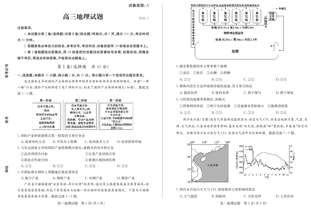 山东省滨州市2024届高三上学期期末考试地理