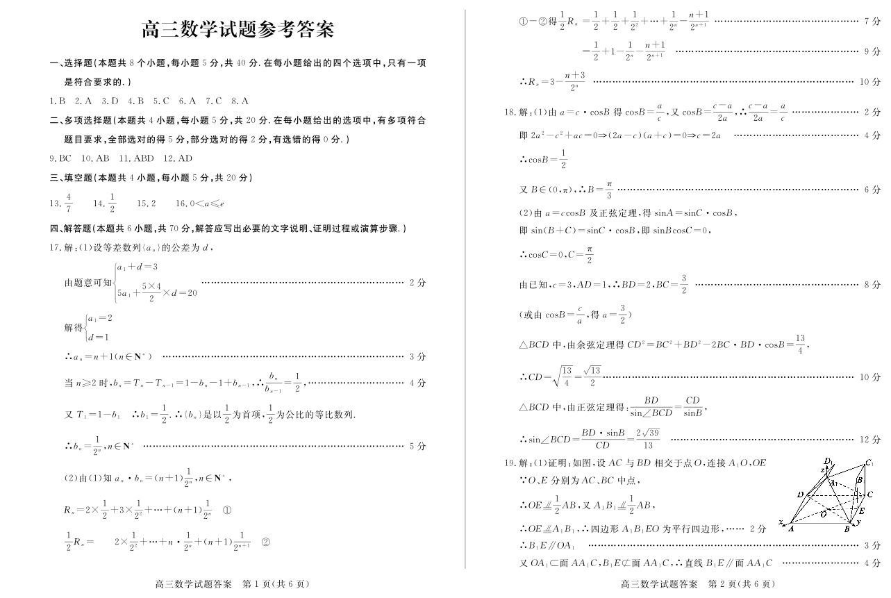 山东省德州市2024届高三上学期期末考试数学答案