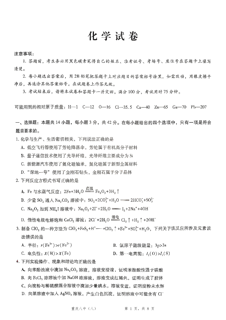 重庆市第八中学校2025届高考适应性月考卷(八)化学