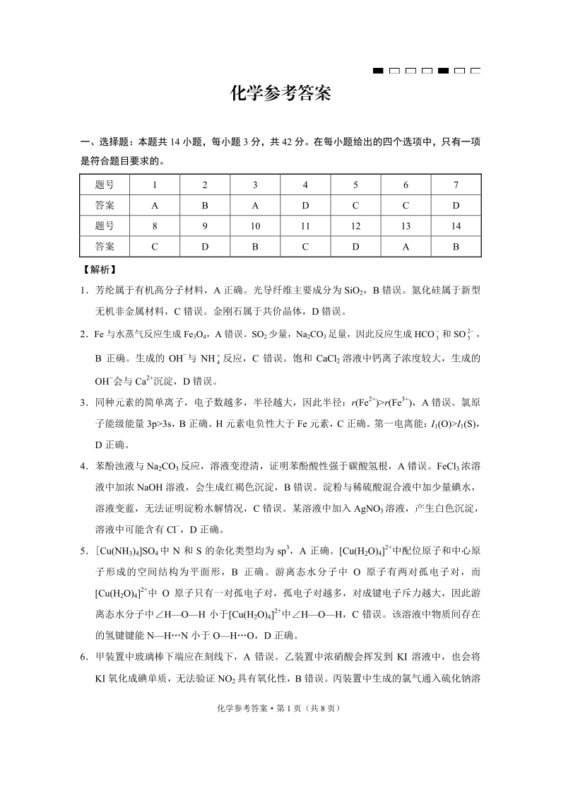 重庆市第八中学校2025届高考适应性月考卷(八)化学答案