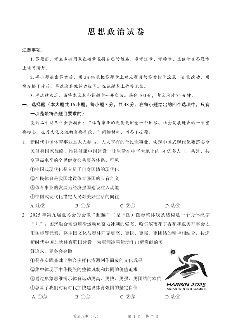 重庆市第八中学校2025届高考适应性月考卷(八)政治