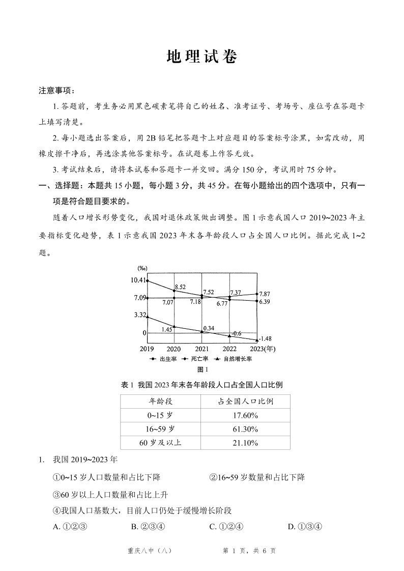 重庆市第八中学校2025届高考适应性月考卷(八)地理
