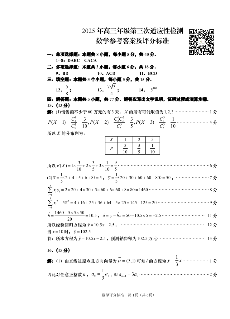 山东省青岛市2024-2025学年下学期5月高三三模考试数学答案