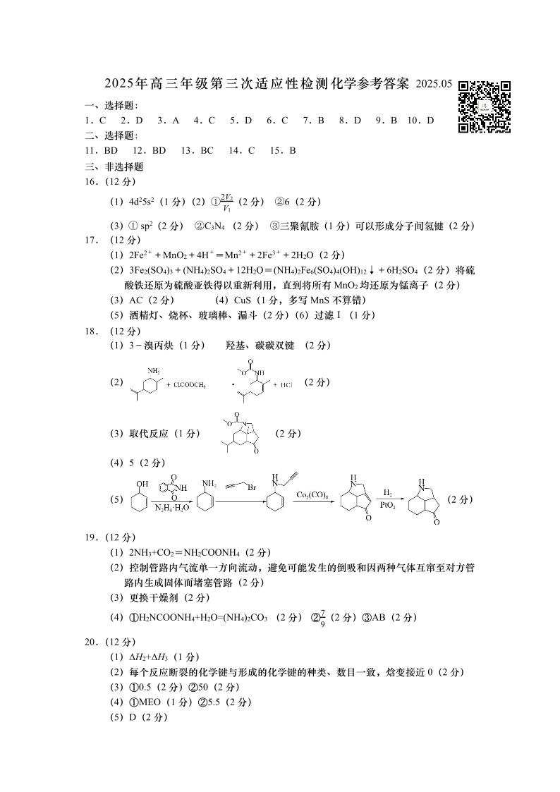 山东省青岛市2024-2025学年下学期5月高三三模考试化学答案