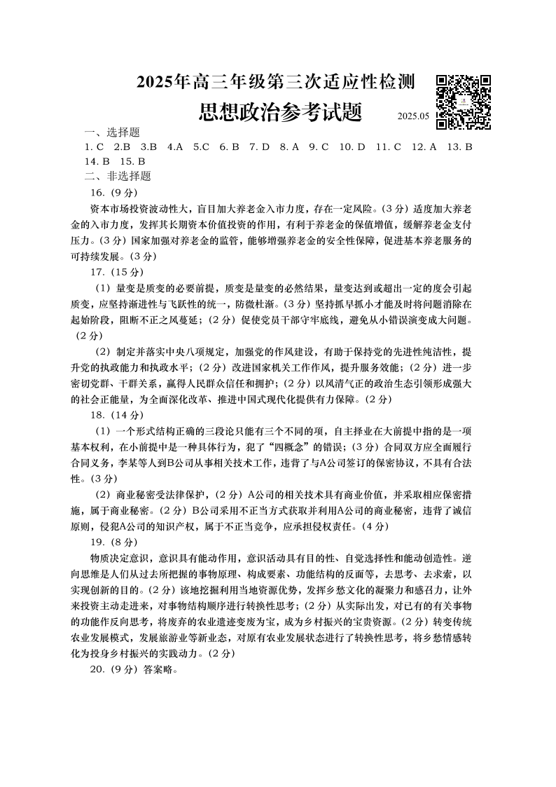 山东省青岛市2024-2025学年下学期5月高三三模考试政治答案