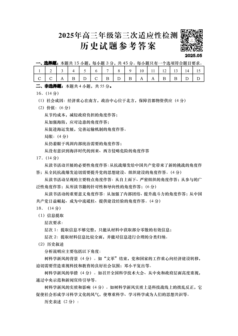 山东省青岛市2024-2025学年下学期5月高三三模考试历史答案