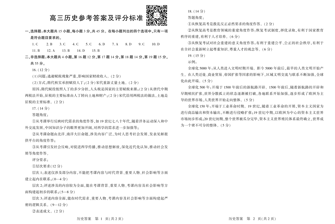 山东省潍坊市2024-2025学年下学期5月高三三模考试历史答案