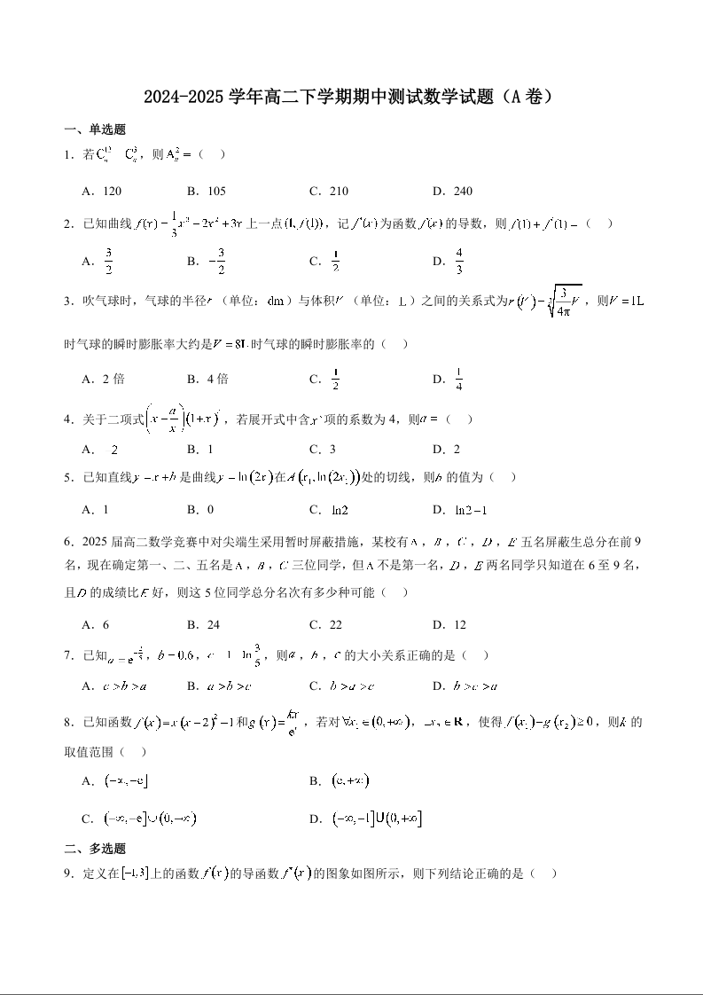 安徽省皖中名校联盟2024-2025学年高二下学期期中考试数学+答案