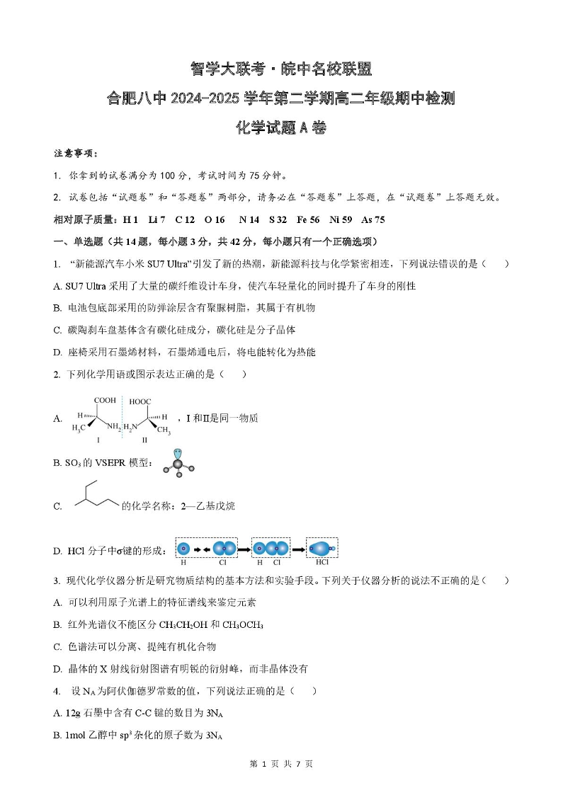 安徽省皖中名校联盟2024-2025学年高二下学期期中考试化学+答案