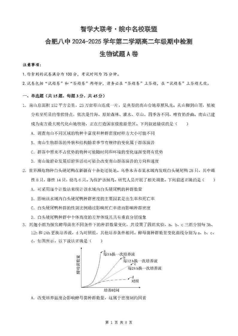 安徽省皖中名校联盟2024-2025学年高二下学期期中考试生物