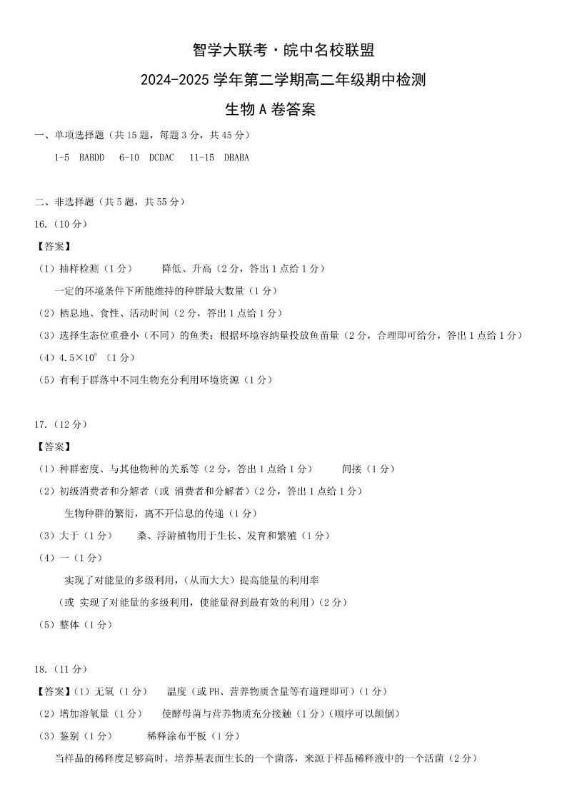 安徽省皖中名校联盟2024-2025学年高二下学期期中考试生物答案