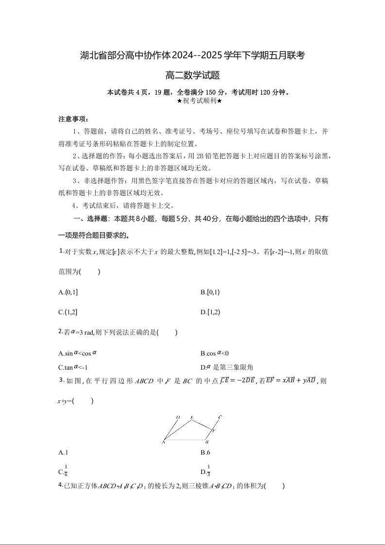 湖北省部分高中协作体联考2024-2025学年下学期5月高二月考数学(原卷板)