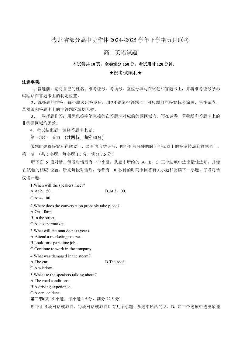 湖北省部分高中协作体联考2024-2025学年高二下学期5月月考英语+答案