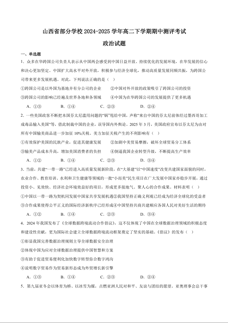 山西省部分学校2024-2025学年下学期高二期中考试政治+答案
