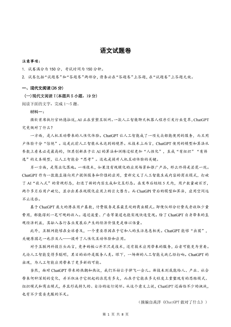 安徽省皖中名校联盟2024-2025学年下学期高一期中考试语文+答案
