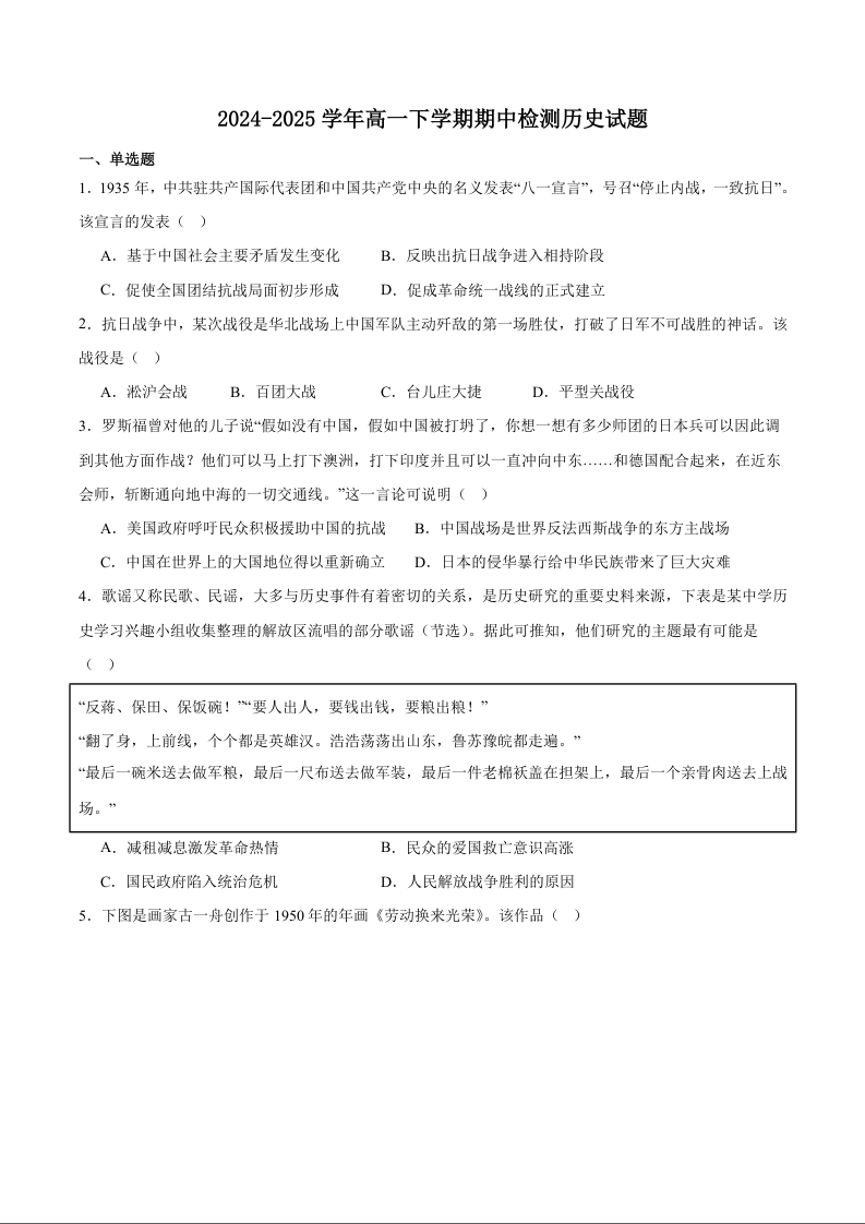 安徽省皖中名校联盟2024-2025学年下学期高一期中考试历史+答案