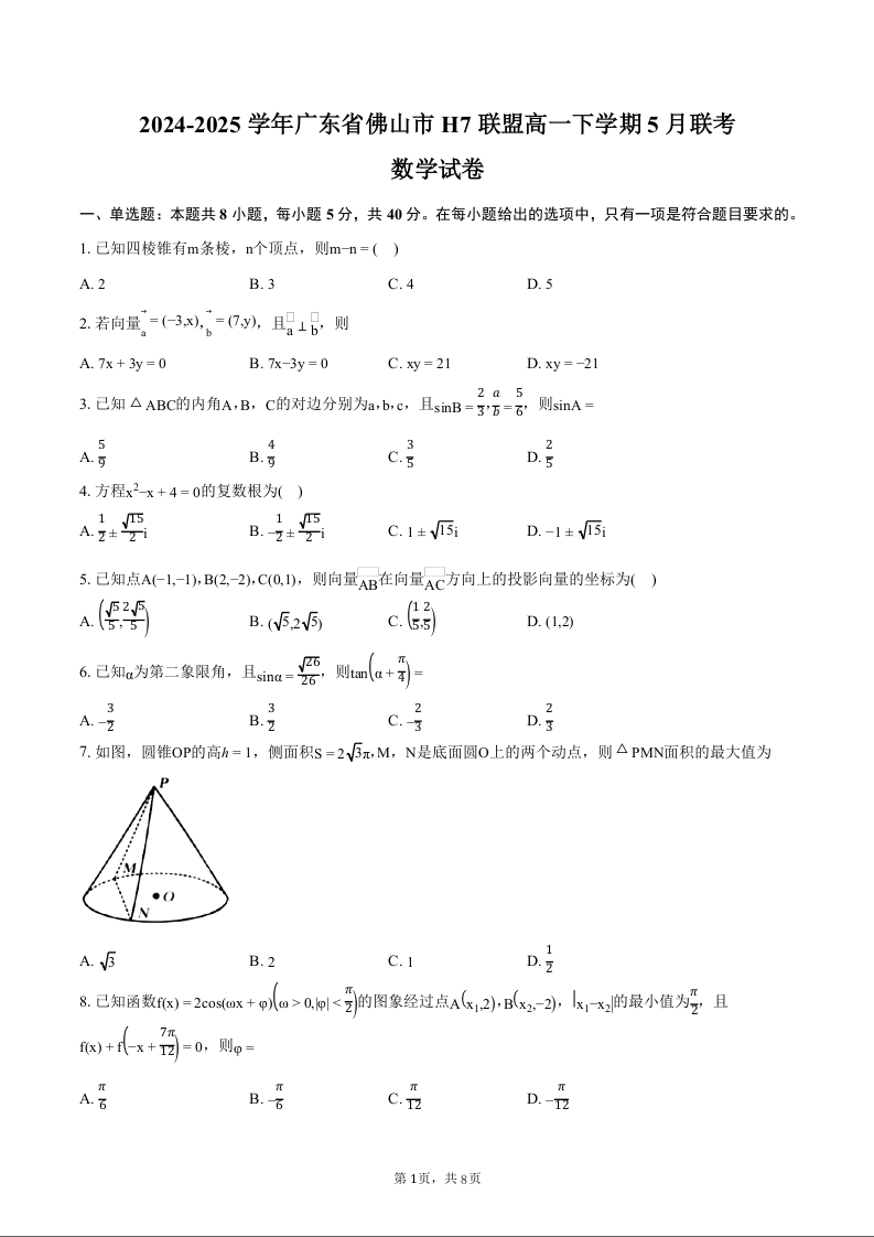 广东省佛山市H7联盟2024-2025学年下学期5月高一月考数学+答案