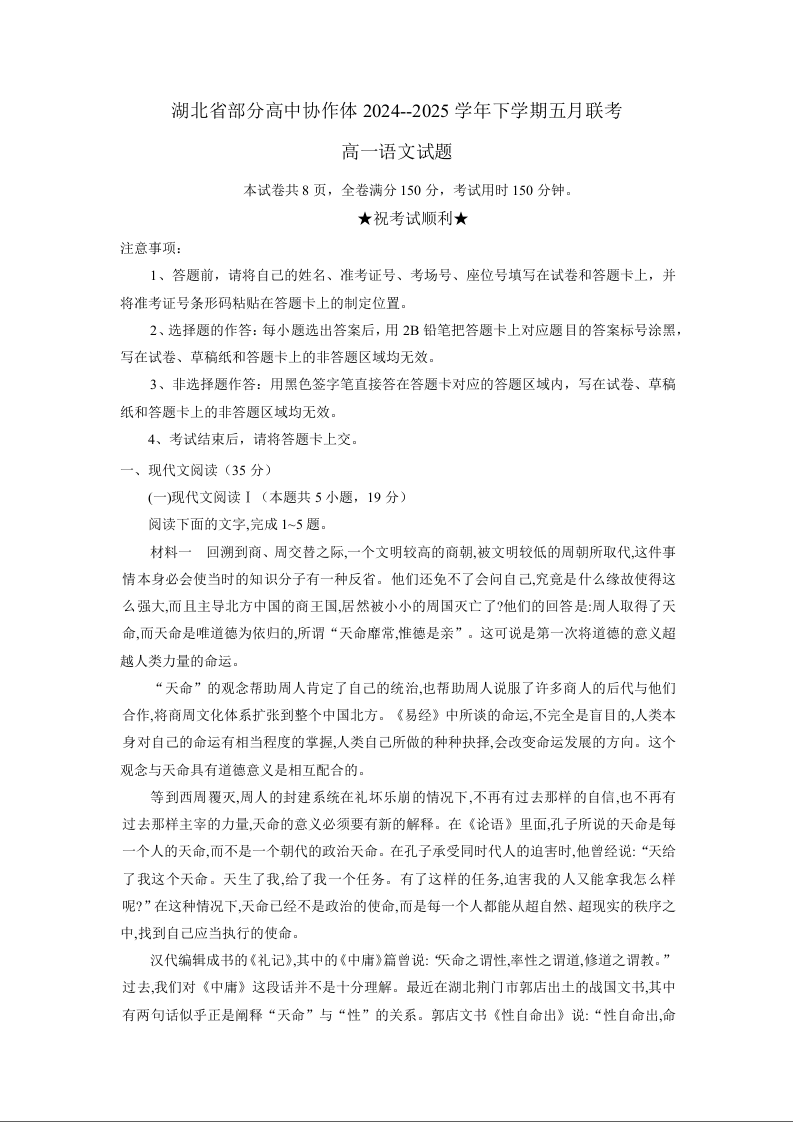 湖北省部分高中协作体联考2024-2025学年下学期5月高一月考语文