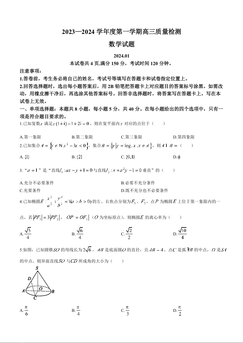 山东省济宁市2024届高三上学期1月期末数学+答案