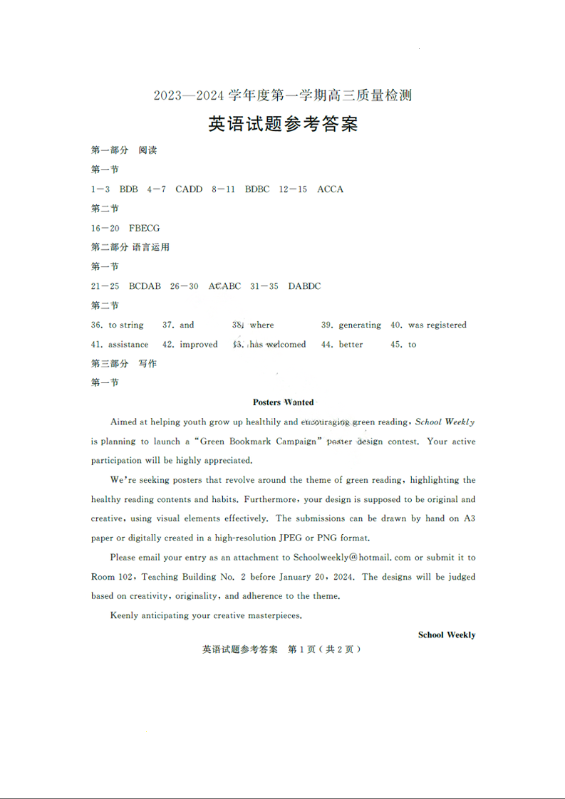 山东省济宁市2024届高三上学期1月期末英语答案