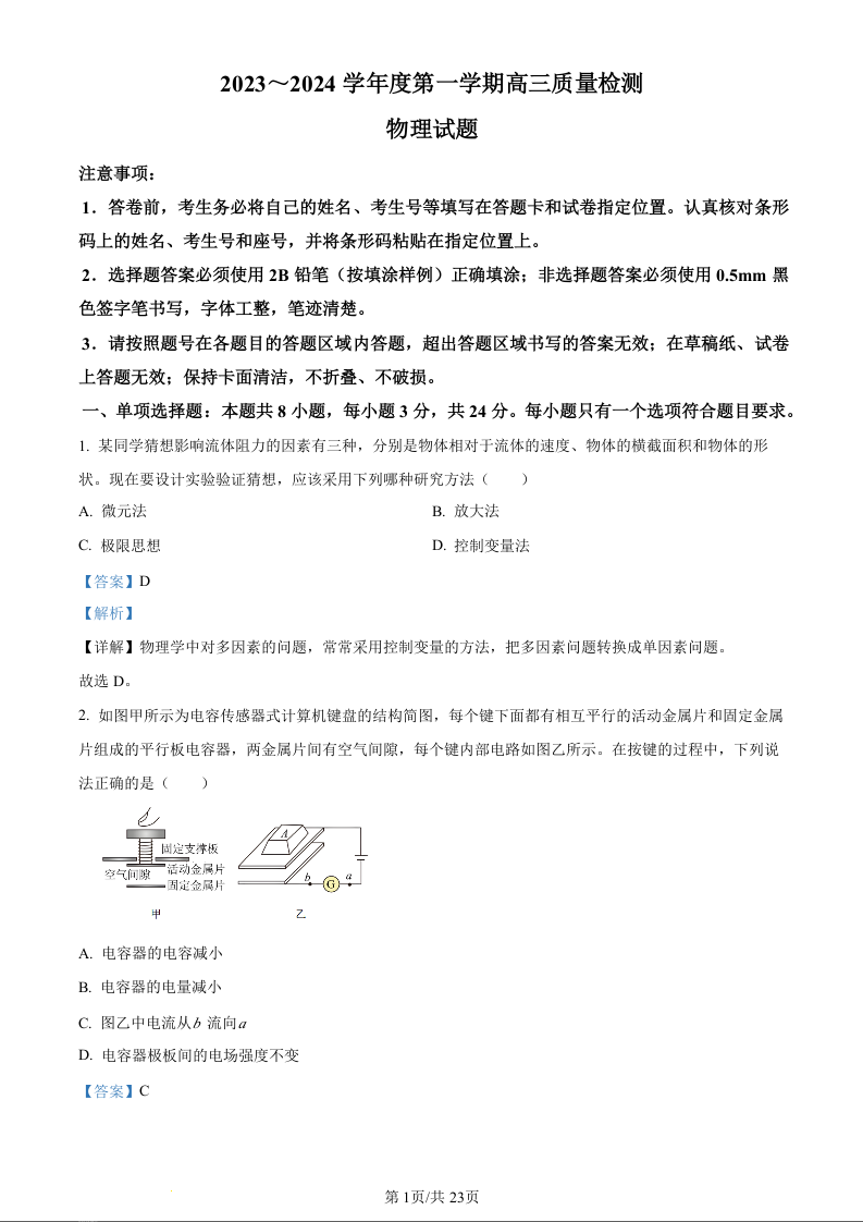 山东省济宁市2024届高三上学期1月期末物理(精品解析版)