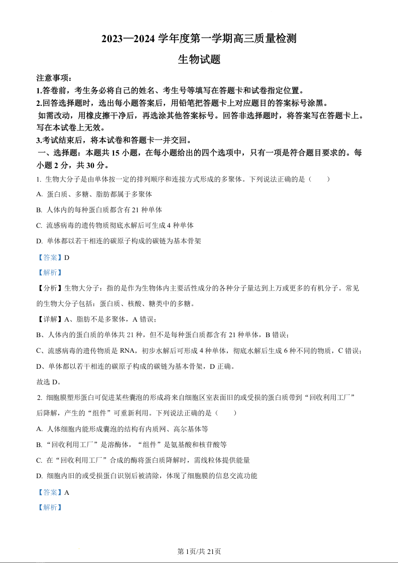 山东省济宁市2024届高三上学期1月期末生物试题(精品解析版)