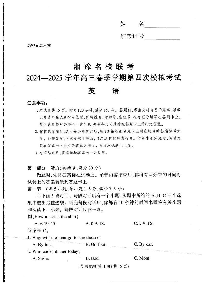 湘豫名校联考2025届高三下学期第四次模拟考试英语+答案