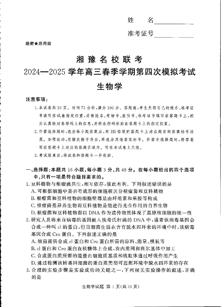 湘豫名校联考2025届高三下学期第四次模拟考试生物