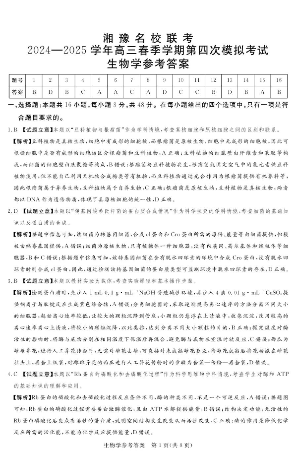 湘豫名校联考2025届高三下学期第四次模拟考试生物答案