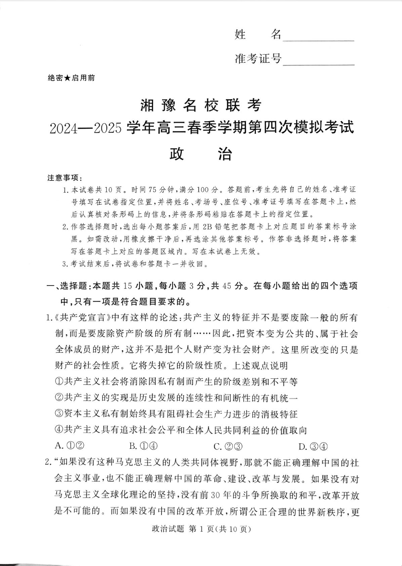 湘豫名校联考2025届高三下学期第四次模拟考试政治+答案